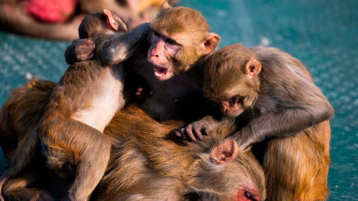 A monkey was caught on camera rushing out of hiding to hug her baby just moments after it was freed from netting by villagers. The footage of the rescue was recorded by an onlooker in India. In it, a baby monkey can be heard squealing after getting stuck in a bundle of netting that was being used to protect a house's TV antenna. Eventually, a man is able to free the monkey, whose mother rushes to pick it up. Mama was clearly worried and watching from a distance and was there as soon as her baby was released.