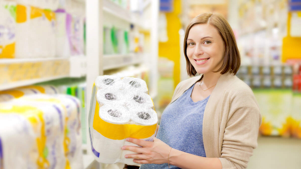 pregnant woman buys toilet paper in the supermarket